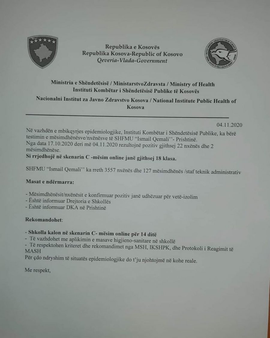 Nesër do të mbyllet shkolla Ismail Qemali në Prishtinë shkaku i rasteve me koronavirus.