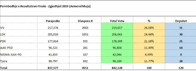 Ndërkaq sipas analistit Armend Muja Nisma ka mbetur jashtë Kuvendit ku me mbledhjen totale të voatve të rregullta dhe atyre të diasporës Nisma ka 4.99% të votave.