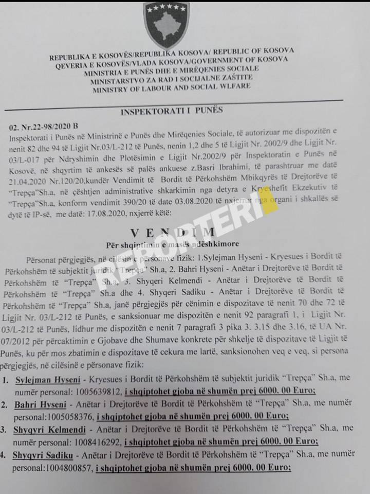 Sylejman Hyseni, Bahri Hyseni, Shyqyri Kelmendi dhe Shyqyri Sadiku janë dënuar me nga 6 mijë euro në cilësinë e personave fizikë thuhet në vendimin e Inspektoratit të Punës të siguruar nga Gazeta Online Veriu.info që mbanë datën 17 Gusht 2020.