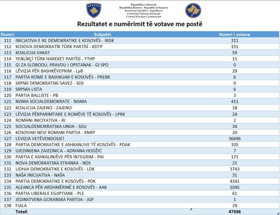 Sipas këtyre rezultateve, Lëvizja Vetëvendosje prinë me 36 mijë e 696 vota, e dyta renditet Partia Demokratike e Kosovës me 4 mijë e 341 vota, e treta Lidhja Demokratike e Kosovës me 3 mijë e 743 vota, Aleanca për Ardhmërinë e Kosovës me 1 mijë e 45 vota, Nisma Socialdemokrate 411 vota, ndërsa pjesa tjetër e votave është shpërndarë nëpër subjektet e tjera politike.