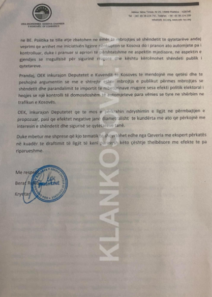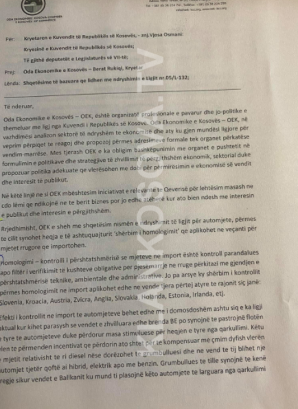 Gjithashtu në dokumentin që ka siguruar Klan Kosova, Oda Ekonomike vlerëson se efekti i kontrollit në import të automjeteve bëhet edhe më i domosdoshëm ashtu siç e ka ligji aktual.