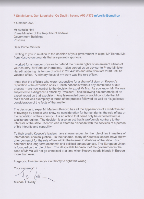 Micheal O’Reilly në letrën e dërguar sqaron se ka punuar si këshilltar i ish-kryeministrit Ramush Haradinaj, teksa thotë se personat që kanë qenë përgjegjës në kohën e deportimit të gjashtë shtetasve turq nga Kosova, janë tashmë ata që kanë marrë vendim për deportimin e Tienmu Ma.
