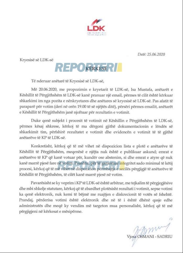 “Duke qenë subjet i procesit të votimit në Këshillin e Përgjithshëm të LDK-së, përmes kësaj shkrese kërkoj të ma dërgoni gjithë dokumentacionin e lëndës së shkarkimit tim, përfshirë këtu rezultatet e votimit dhe evidencën e votimit të të gjithë anëtarëve të KP të LDKsë”.