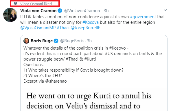 “Nëse LDK-ja paraqet mocion mosbesimi ndaj Qeverisë, pjesë e së cilës është, atëherë një gjë e tillë do të nënkuptonte katstrofë, jo vetëm për Kosovën, por edhe rajonin”, ka shkruar në “Twitter” Viola von Cramon.