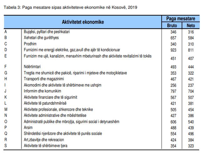 “Paga mesatare bruto në vitin 2019 sipas aktiviteteve ekonomike më e lartë ishte te: Furnizimi me energji elektrike, gaz,avull dhe ajër të kondicionuar me 923 euro pasuar nga informimi dhe komunikimi me 797 euro, pastaj xehëtari dhe gurëthyes me 657 euro, derisa paga më e ulët ishte tek Akomodimi dhe aktivitete të shërbimeve me ushqim me 256 euro”, thuhet në raport.