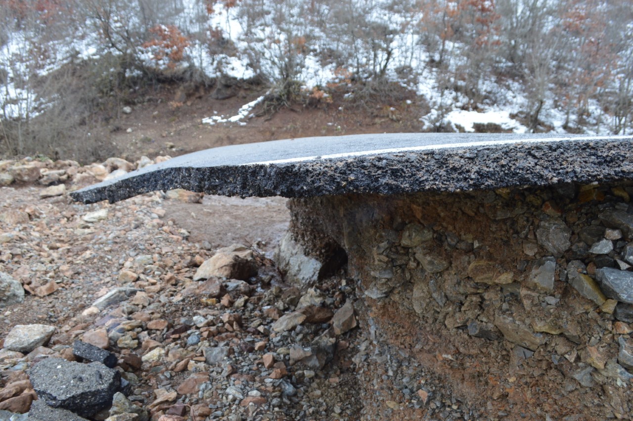 Në fotografitë e dërguara nga komuna, shihet se si rruga është këputur dhe asfalti është larguar në tërësi.