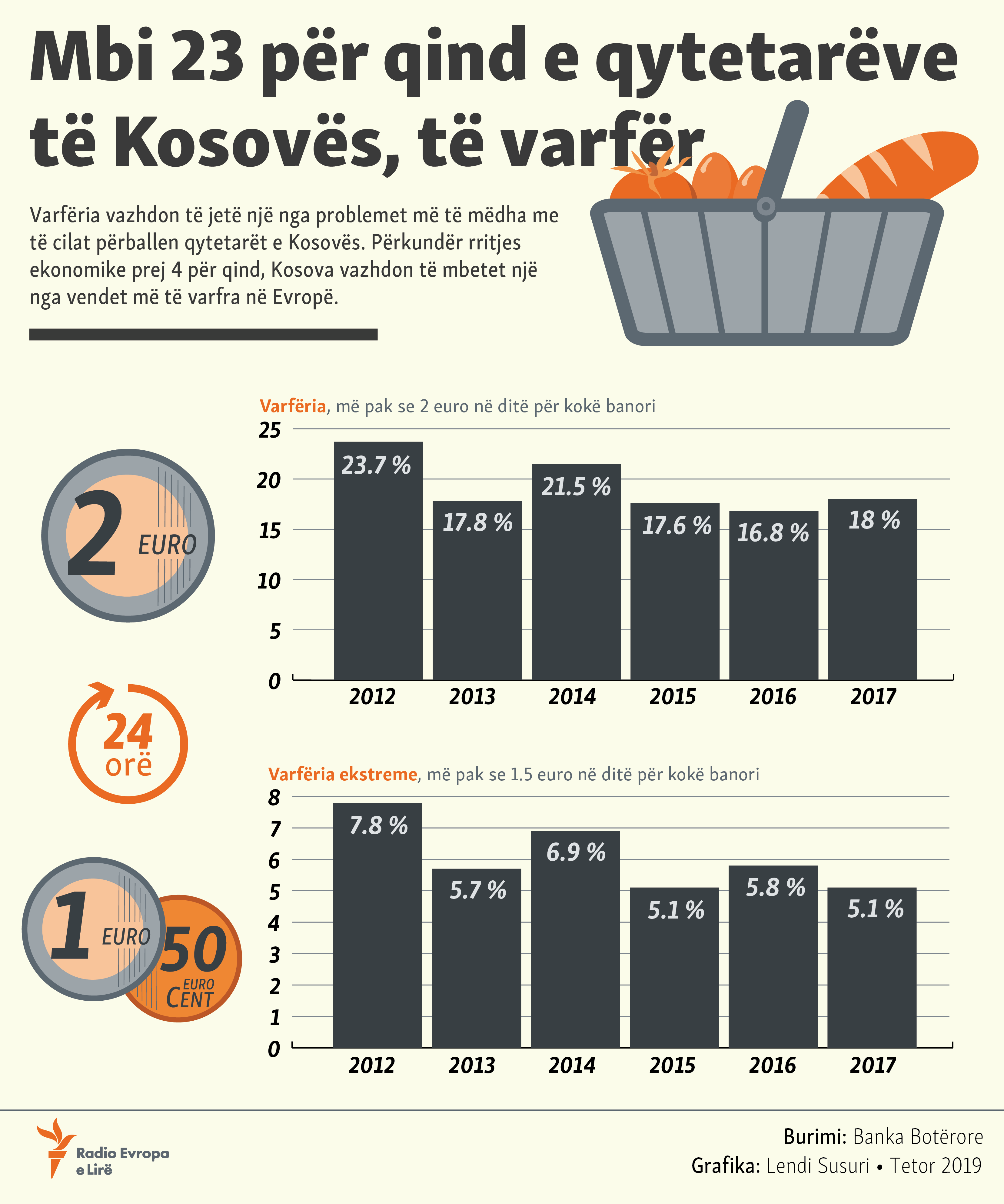 Sipas këtyre të dhënave të Bankës Botërore, rreth 18 për qind e popullatës në Kosovë jeton në varfëri me më pak se 2 euro në ditë, ndërsa 5 për qind e popullsisë jeton nën kufirin e varfërisë ekstreme ose me më pak se 1.50 euro në ditë.