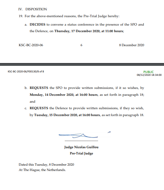 Gjyqtari i procedurës paraprake me këtë rast ka kërkuar nga mbrojtja që të dërgojë parashtresat me shkrim deri më 15 dhjetor në orën 16:00.