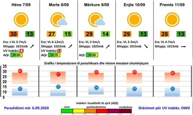 Temperaturat minimale do të luhaten nga 13C deri në 15C, ndërsa maksimalet nga 27C deri në 30C. Era do të fryjë kryesisht nga verilindja e lehtë dhe mesatare 3-7m/s, ditën e martë me hove deri në 12m/s.
