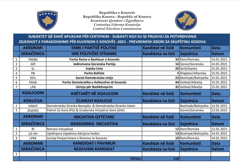 Përveç këtyre partive që janë në listën e mëposhtme, partitë e tjera politike ende nuk i kanë dorëzuar listat e tyre zgjedhore në KQZ, ndërsa afati për aplikim është i hapur nga 8 deri më 16 janar në ora 18:00.