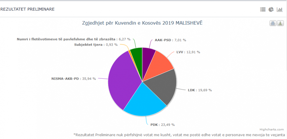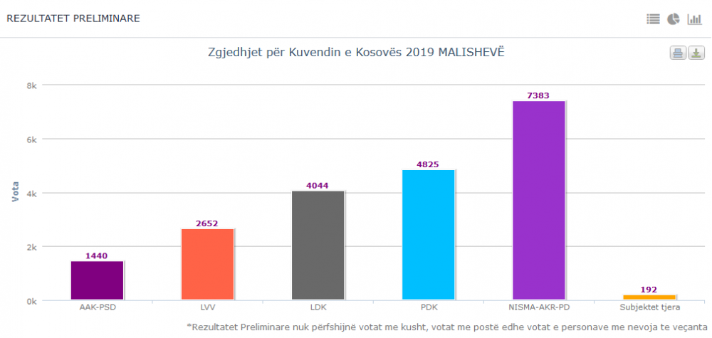 E dyta në rezultatet preliminare të publikuara nga KQZ’ja për Malishevë del të jetë Partia Demokratike e Kosovës me 4825 vota ose 23.49 për qind.