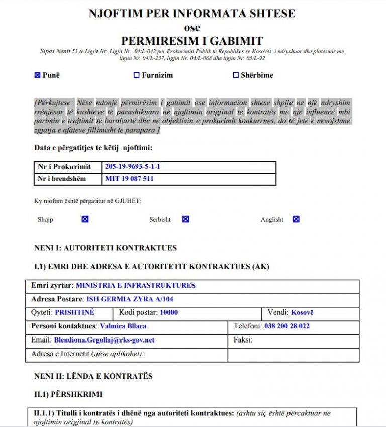 Në ueb-faqen e KRPP-së, sot është publikuar njoftimi i ministrisë me titull “Njoftim për informata shtesë ose përmirësim i gabimit”.