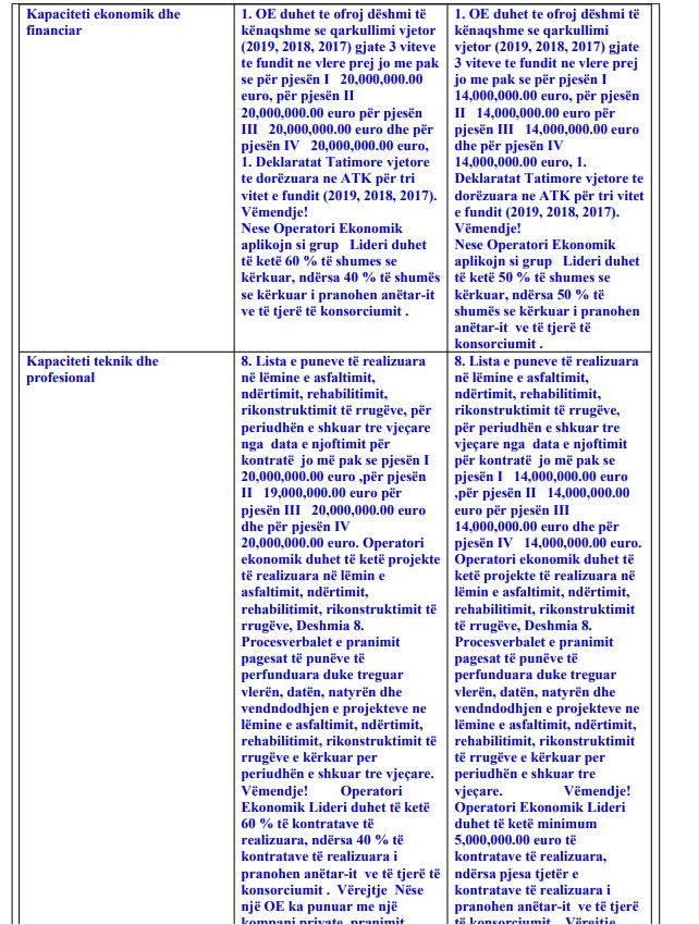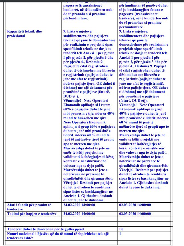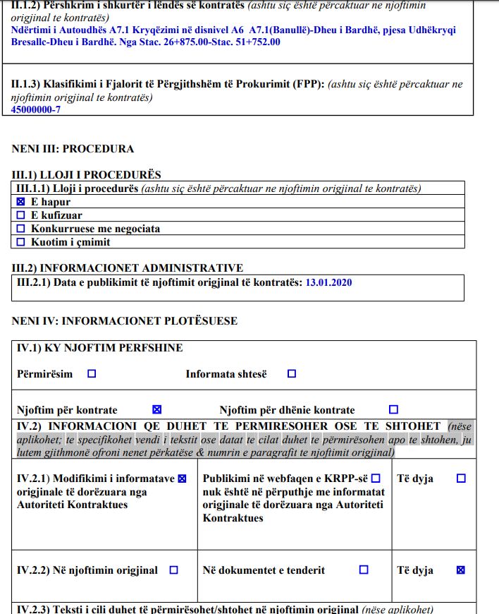 Pra, nëpërmjet këtij formulari, prokurimi i ministrisë ka bërë njoftim për përmirësimin e disa kritereve bazë të njoftimit për kontratë, siç janë “kapacitetet ekonomike dhe financiare”, “kapacitetet ekonomike dhe profesionale”. Po ashtu, është bërë njoftim se garuesit mund të ofertojnë më shumë se për një pjesë të tenderit, pasi tenderi në tersi është i ndarë në 4 pjesë (loto). Po sipas këtij njoftimi, afati i fundit për pranimin e tenderëve është data 24 shkurt 2020, ora 14:00.