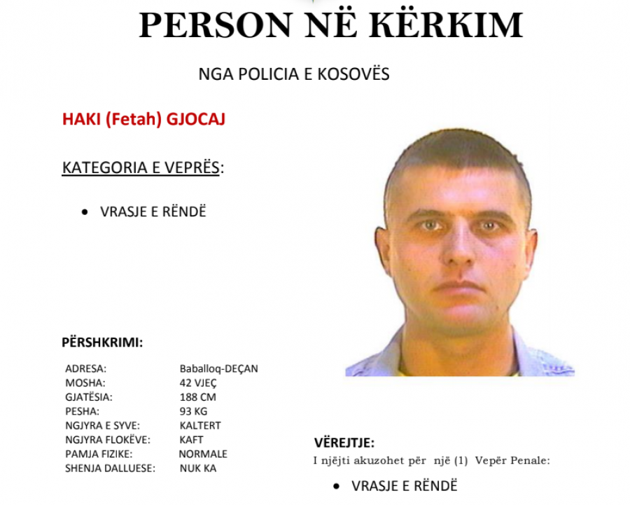 Sipas njoftimit personi i kërkuar është: Haki ( Fetah) Gjocaj i lindur me 04.02.1977 në fshatin Baballoq-Deçan.
