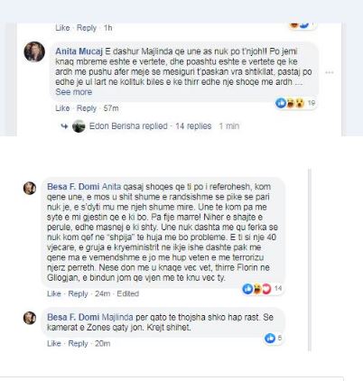 “Anita qasaj shoqes qe ti po i referohesh, kom qene une, e mos u shit shume e randsishme se pike se pari nuk je, e s’dyti mu me njeh shume mire. Une te kom pa me syte e mi gjestin qe e ki bo. Pa fije marre! Niher e shajte e perule, edhe masnej e ki shty. Une nuk dashta me qu ferka se nuk kom qef ne “shpija” te huja me bo probleme. E ti si nje 40 vjecare, e gruja e kryeministrit ne ikje ishe dashte pak me qene ma e vemendshme e jo me hup veten e me terrorizu njerz perreth. Nese don me u knaqe vec vet, thirre Florin ne Gllogjan, e bindun jom qe vjen me te knu vec ty”, ka shkruar Domi.