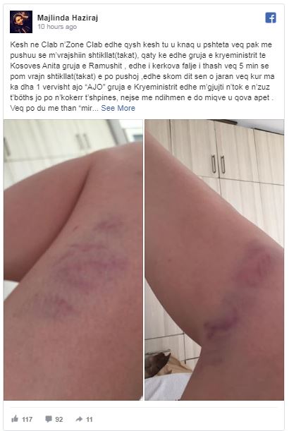 Majlinda Haziraj po pretendon se gruaja e Kryeministrit Ramush Haradinaj e ka rrahur në një lokal. Ajo në Facebook ka publikuar edhe foto me të cilat pretendon se e dëshmon lëndimet që ka pësuar.