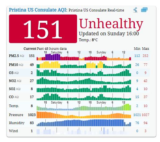 Ajri i ndotur vazhdon të jetë shqetësues për qytetarët e Prishtinës.Sikur të mos mjaftonte vetëm kjo, ditëve të fundit, Prishtina është përballur edhe me mjegull shumë të dendur.Në bazë të matjes së fundit që është bërë nga Ambasada amerikane në Kosovë për cilësinë e ajrit, në ora 16:00 shkalla e ndotjes ka arritur në 151, shkruan lajmi.net.