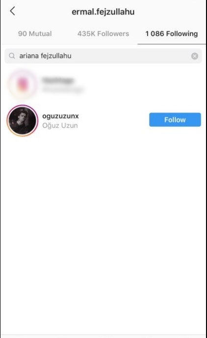 Nëse kërkohet Ariana, automatikisht gjindet djali me emrin Oğuz Uzun i cili i ka hequr ‘followin’ Ermalit ndërsa ai vazhdon ta ndjekë.