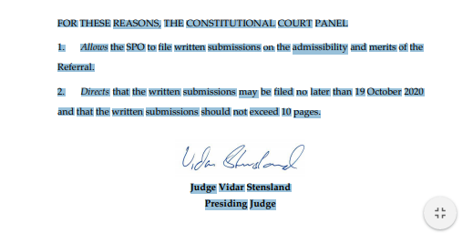 Kjo kërkesë e prokurorisë është pranuar nga Paneli i Kushtetueses në Speciale, dhe të njëjtës po ashtu i është dhënë afat që deri më 19 tetor të dorëzojë opinionin dhe shkresat e saja, jo më të gjata se 10 faqe.
