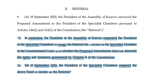 Më 18 shtator, ky amandament i ishte dorëzuar nga Kuvendi i Kosovës, presidentit të Dhomave të Specializuara të Gjykatës. Në dokumentet që i ka parë lajmi.net, bëhet e ditur se kryetarja e Kuvendit të Kosovës, Vjosa Osmani, kishte kërkuar opinion nga Dhoma e Posaçme e Kushtetueses në Speciale, se a i shkel ky amandament të drejtat dhe liritë themelore të garantuara me Kapitullin 2 të Kushtetutës.