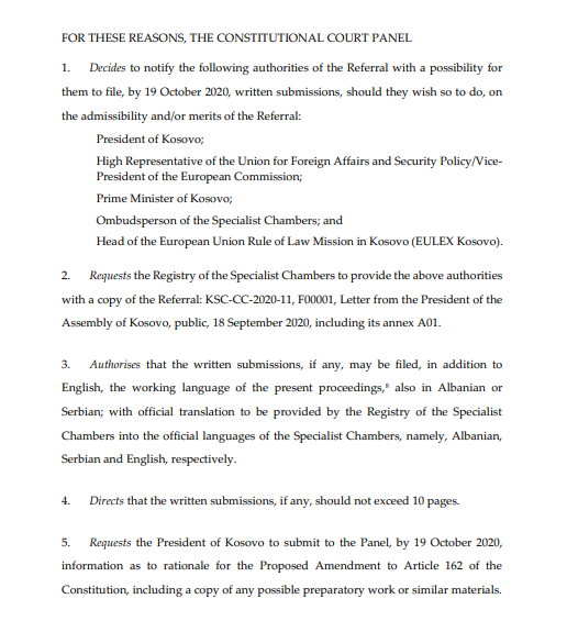 E kërkesa më specifike ka qenë ndaj presidentit Thaçi. Ndaj këtij të fundit, Paneli i Kushtetueses ka kërkuar që po ashtu deri më datë 19 tetor, të paraqesë arsyetimin e tij për amandamentin e propozuar. Nga palët është kërkuar që shkresat të jenë sa më racionale, të kuptueshme, dhe jo më të gjatë se 10 faqe.