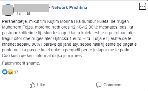 Një person ka njoftuar se mikut të tij, pronarit të një lokalit, i ka humbur kuleta, në rrugën “Muharrem Fejza” në Prishtinë, mbrëmë rreth orës 00:30.