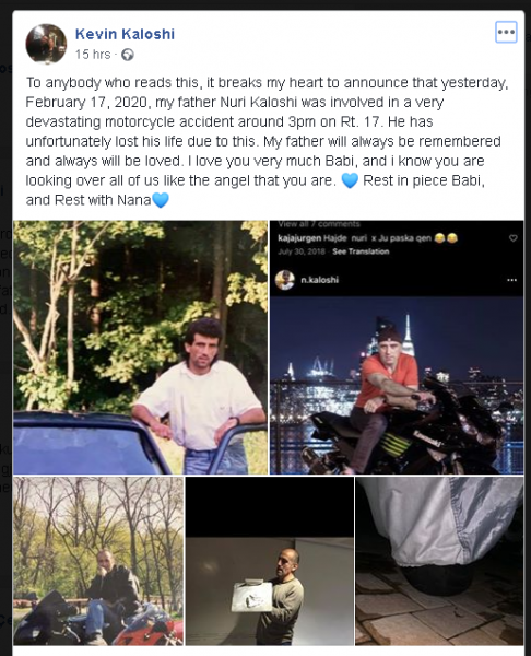“Për këdo që e lexon këtë, më thyhet zemra të njoftoj se më 17 shkurt 2020, babai im Nuri Kaloshi u përfshi në një aksident shumë shkatërrues të motorëve rreth orës 3 të mëngjesit në Rt. 17. Ai për fat të keq humbi jetën. Babai im gjithmonë do të mbahet mend dhe gjithmonë do të dashurohet. Unë të dua shumë Babi dhe e di që po na shikon të gjithëve ne si engjëll që je. Pushofsh në paqe Babi dhe pushoni me Nanën”, ka shkruar ai në profilin personal.