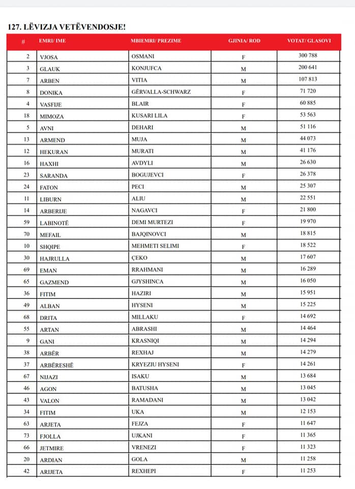 LVV-ja ka marrë 58 deputetë ndërsa, më e votuara në këtë listë është Vjosa Osmani.
