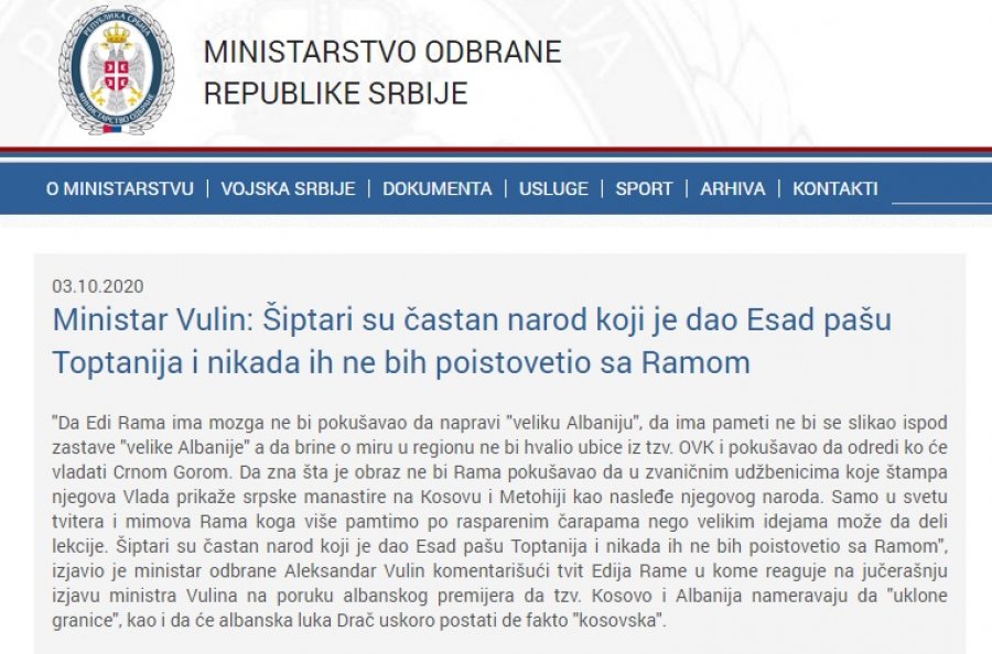 Ministri i Mbrojtjes i Serbisë, Aleksandar Vulin, ka vazhduar të fyejë shqiptarët. Kësaj here ka zgjedhur që fyerjet t’i adresojë përmes faqes zyrtare të Ministrisë së Mbrojtjes së Serbisë.