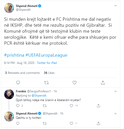 Ahmeti derisa ka bërë një postim për 8 futbollistë prishtinas që dolën pozitiv me COVID-19, nga një qytetar është pyetur se si i shkoi ndeja me zyrtarët e PDK-së.