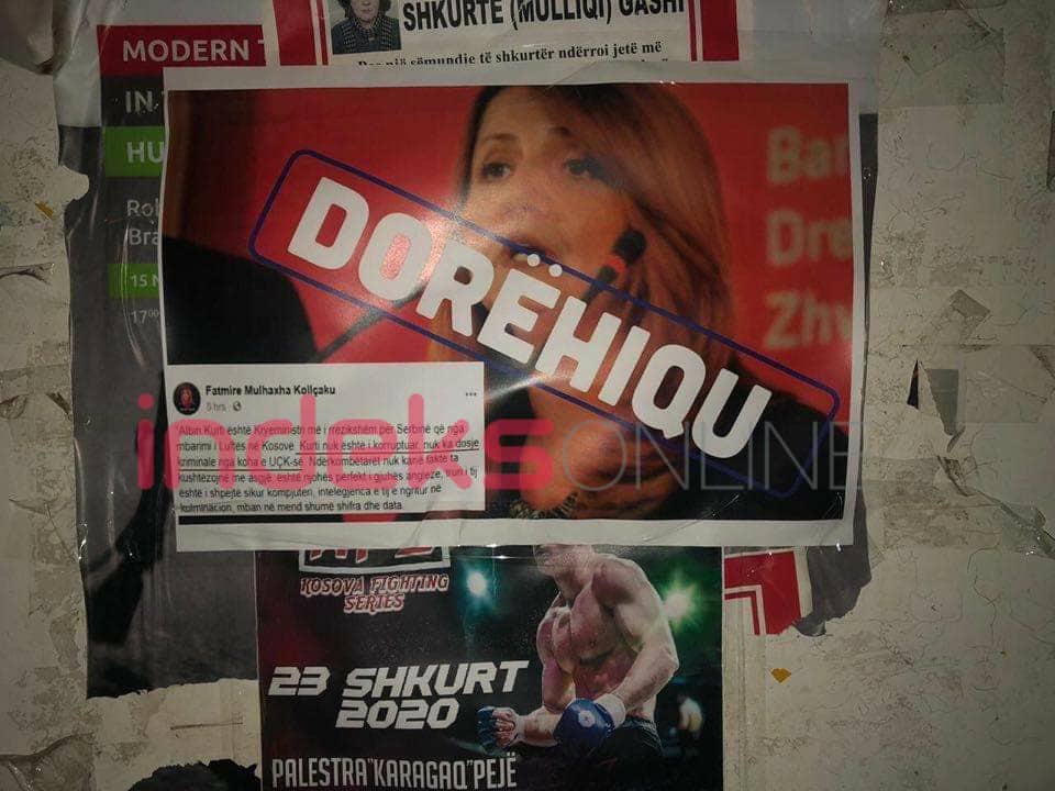 Sot në orët e para të mëngjesit, në qytetin e saj të lindjes, Pejën u panë dhjetëra posterë, ku shihet fotografia e Kollçakut dhe mbi të fjala “Dorëhiqu”, ndërsa citohen edhe fjalët e saj që publikoi në Facebook.