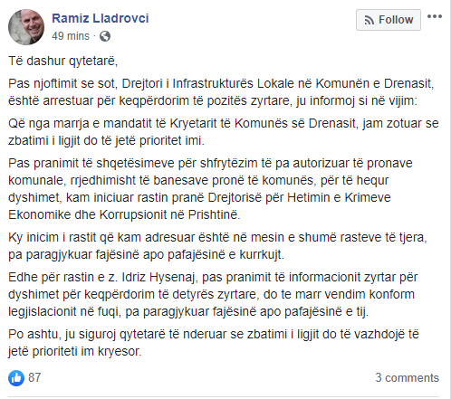 “Ky inicim i rastit që kam adresuar është në mesin e shumë rasteve të tjera, pa paragjykuar fajësinë apo pafajësinë e kurrkujt”, shkruan Lladrovci.