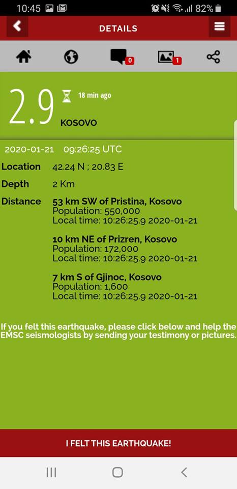 Njëri prej tërmeteve është regjistruar 53 kilometra në jugperëndim të Prishtinës, 10 kilometra në verilindje të Prizrenit dhe në Gjinoc të Suharekës, sipas LastQuake.