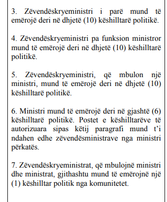 Kujtojmë se në qeverinë Haradinaj, zëvendëskryeministrat kanë pasur të drejtë të emërojnë vetëm deri në gjashtë këshilltarë politikë, kurse tani kjo ka ndryshuar dhe mund të emërohen deri në dhjetë këshilltarë politikë të brendshëm.