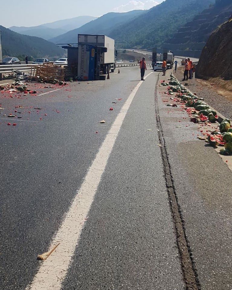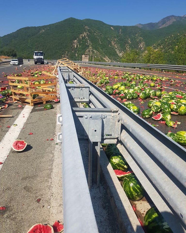 Rruga e Kombit mëngjesin e sotëm ka marrë një pamje aspak të mirë. Kjo, pas një aksidenti që ka ndodhur sot e ku është përfshirë një automjet që po transportonte shalqinj.
