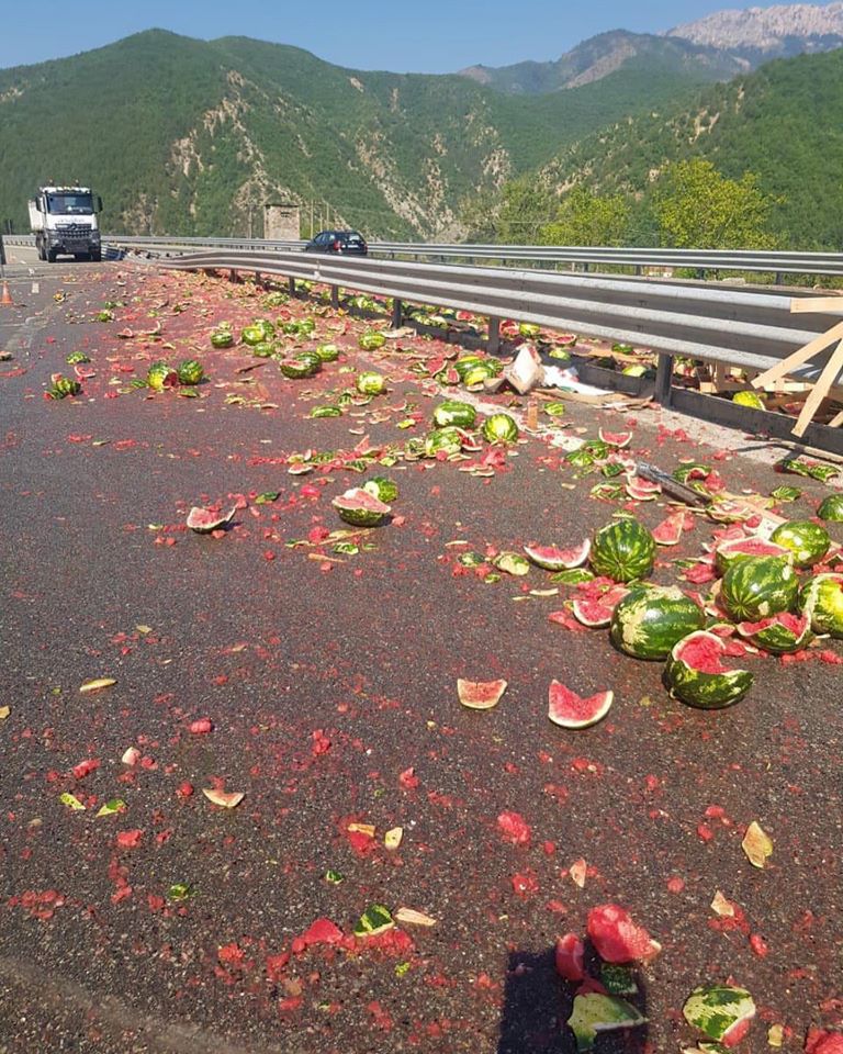 Në pamjet e publikuara në mediat e Shqipërisë shihet se kjo rrugë është “përmbytur” nga shalqinjtë, kjo pasi rimorkio e automjetit që po i transportonte është rrokullisur, shkruan Reporteri.