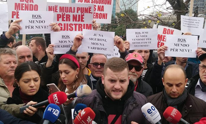 Para Bankës Qendrore të Kosovës me dhjetëra qytetarë po protestojnë për të kundërshtuar vendimin e BQK-së për shtrenjtimin e sigurimeve të automjeteve për...