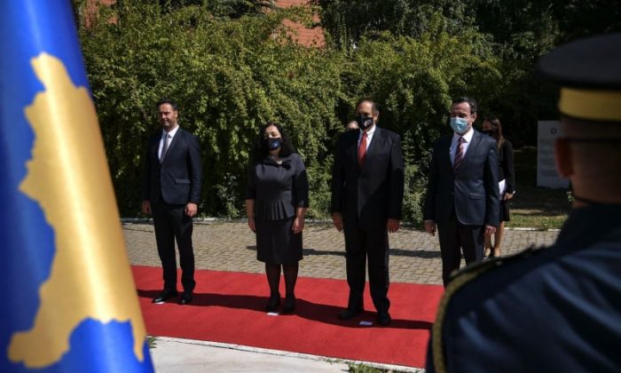 Presidentja e Kosovës Vjosa Osmani kryekuvendari Glauk Konjufca dhe kryeministri Albin Kurti bashkë me zëvendësambasadorin amerikan Nicholas J.Giacobbe kanë bërë...