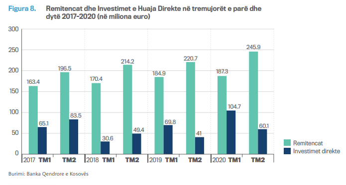 Gjatë vitit 2012, më shumë se 22 përqind e familjeve kosovare kishin deklaruar se pranojnë remitenca nga familjarët e tyre. Ndërkohë në vitin 2019, mbi 850 milionë euro u dërguan nga jashtë apo rreth 12.2 përqind e Bruto Produktit Vendor (BPV), kurse në gjashtëmujorin e parë të këtij viti, mbi 433 milionë euro janë dërguar nga jashtë në forma të ndryshme.