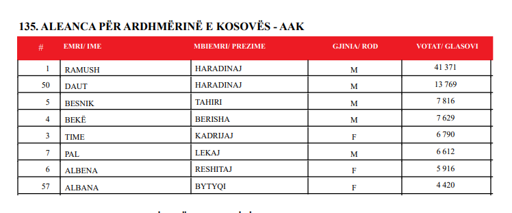 Votat për t’u bërë deputet i siguruan Ramush Haradinaj, Daut Haradinaj, Besnik Tahiri, Bekë Berisha, Time Kadrijaj, Pal Lekaj, Albena Reshitaj dhe Albana Bytyqi.