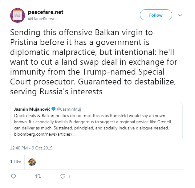 Megjithatë lidhur për këtë shkrim të “Bloomberg” ka reaguar ish-diplomati amerikan, Daniel Serwer, i cili që nga fillimi emërimin e Richard Grenell e ka quajtur si një vendim ‘bizar’ të SHBA-së si dhe një ofendim që po i bëhet Gjermanisë.