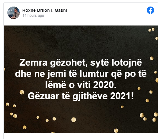 “Zemra gëzohet, sytë lotojnë dhe ne jemi të lumtur që po të lëmë o viti 2020. Gëzuar të gjithëve 2021”, ka shkruar hoxha kosovar Drilon Gashi.