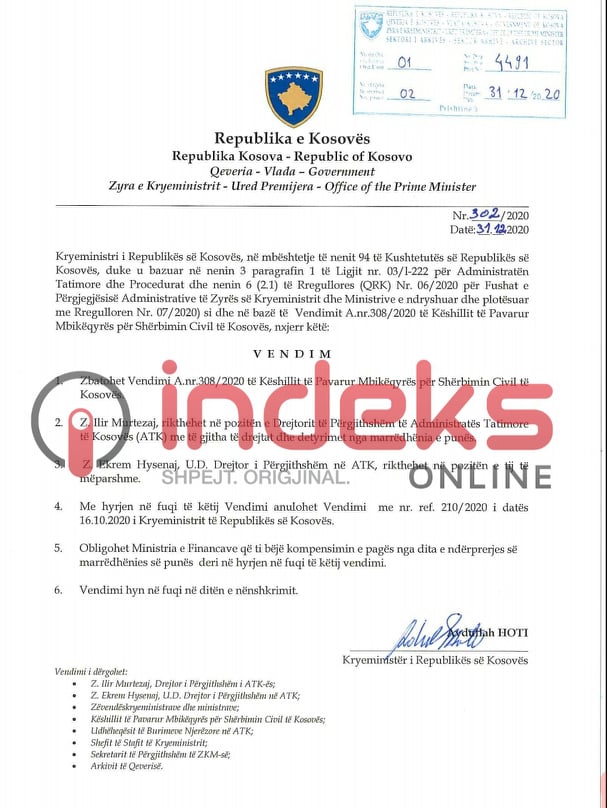 IndeksOnline ka siguruar vendimin e Kryeministrit në detyrë Avdullah Hoti, i cili ka nënshkruar vendimin për kthimin e Murtezajt në pozitën e drejtorit të ATK’së.