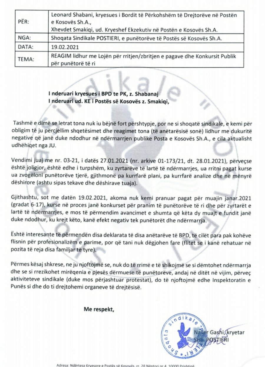 Shoqata Sindikale “Postieri” i ka reaguar kryesuesit të Bordit të Përkohshëm të Drejtorëve në Postën e Kosovës, Leonard Shabanit dhe u.d kryeshefit ekzekutiv Xhevdet Smakiqi, për siç thotë ai, vendimin e fundit mbi rritjen/zbritjen e pagave.