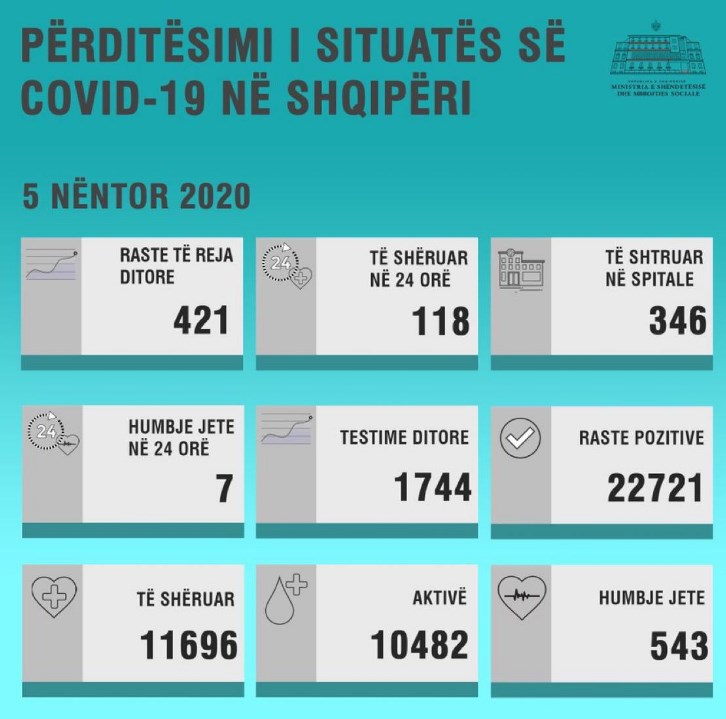 Siç shkruan Ora News, në 24 orët e fundit kanë ndërruar jetë shtatë persona të cilët ishin të infektuar me koronavirus.