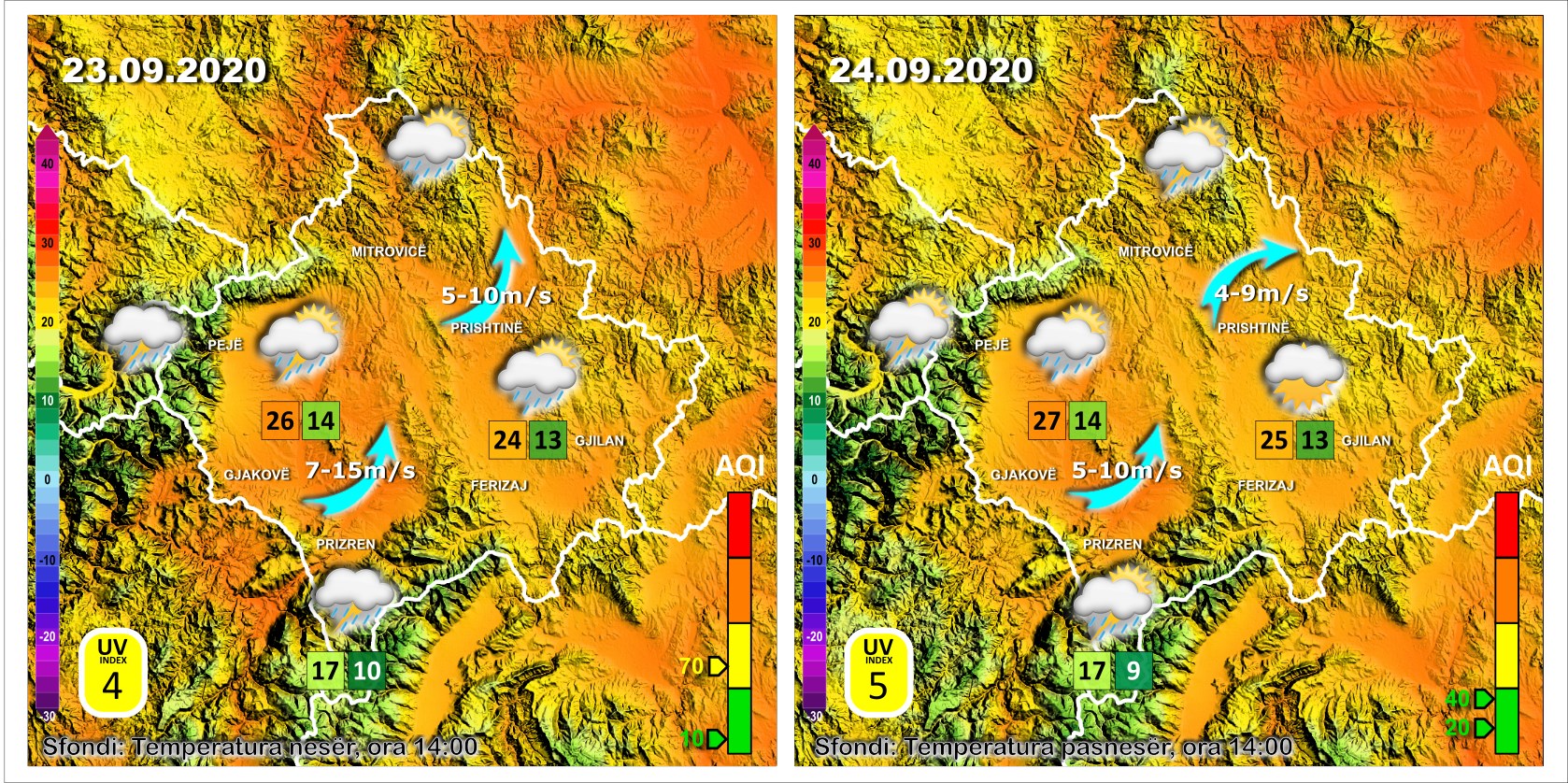 23.9.2020 – Jo shumë ngrohtë, kryesisht me vranësira. Vende-vende priten mundësi për reshje lokale shiu me bubullimë. Temperaturat në vise të ulëta 13C deri 26C, e në vise malore 10 deri 17C. Do të fryj erë e mesatare dhe mesatarisht e fuqishme nga jugperëndimi 5-10m/s, me hove edhe deri në 15m/s. Indeksi UV: 4.