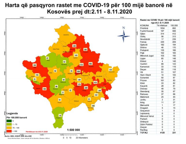 Në bazë të hartës, disa komuna kosovare u vendosën në zonën e kuqe. Zonë kjo me mbi 150 raste të reja për 100 mijë banorë.