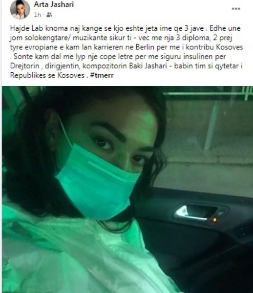 “Hajde Lab, ma këndo ndonjë këngë se kjo është jeta ime që 3 javë. Edhe unë jam solokëngëtare/muzikante, sikur ti – veç me 3 diploma, 2 prej tyre evropiane. E kam lënë karrierën në Berlin për të kontribuar për Kosovën. Sonte kam dalë me lypë një copë letre për të siguruar insulinë për drejtorin, dirigjentin, kompozitorin, Baki Jashari – babain tim, si qytetar i Republikës së Kosovës”, ka shkruar ajo.
