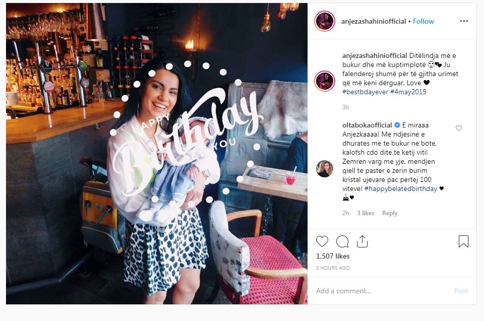 Në foton e publikuar ajo shkroi “Ditëlindja më e bukur dhe më kuptimplotë, Ju falenderoj shumë për të gjitha urimet që më keni dërguar, dita më e bukur në jetën time”.