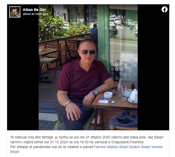 Te nderuar miq dhe familjar, ju njoftoj se sot me 31 dhjetor 2020 ndërroi jete baba jone, Ilaz Beqiri varrimi i ndjerit behet sot 31.12.2020 ne ora 16:00 ne varrezat e Dragodanit,Prishtine.